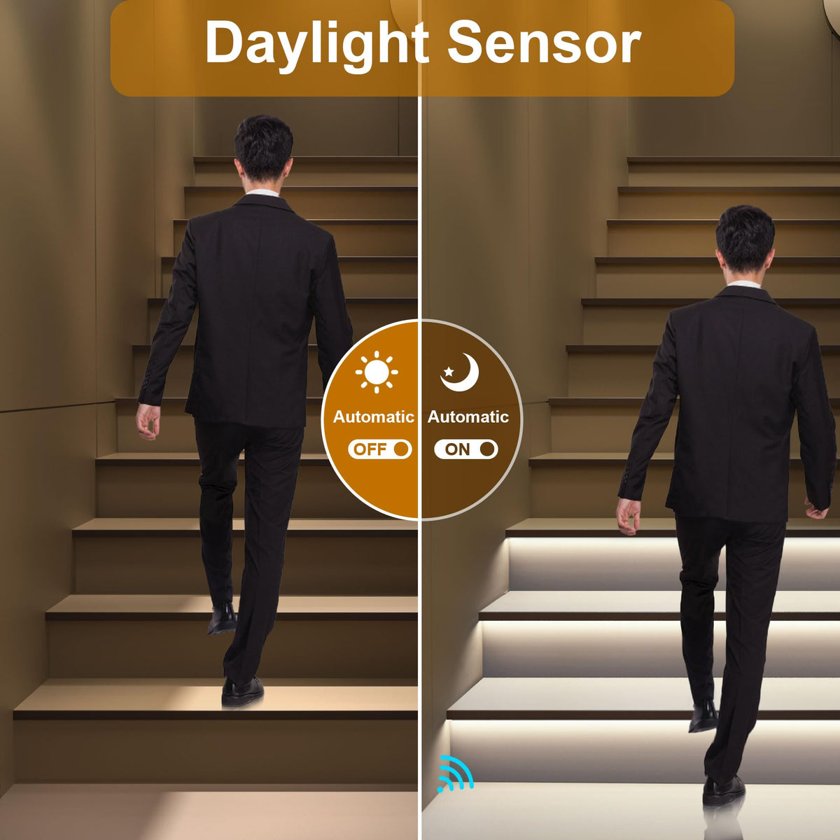 - MULTI-FUNCTIONALITY: Enjoy versatile control with adjustable step number, brightness, speed, and delay time, allowing you to customize your lighting experience.There are multiple functions to choose from: Motion sensor mode/ Daylight Sensor mode/ Light stay on mode/ Cascade mode/ Sync mode